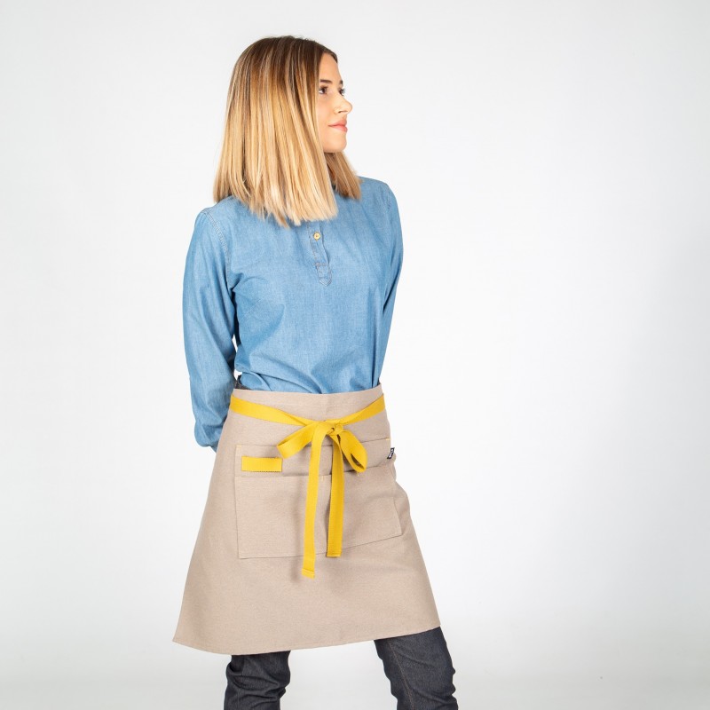 - Corto con cuatro bolsillos delanteros en la zona central y tiras para anudar en espiga de color mostaza
