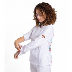 Chaqueta Reytex de cocinera mujer modelo BRASEADA CC1467 DP32, Con espalda estampada en tejido técnico transpirable, 59% algodón, 39% poliéster, 2% elastano.