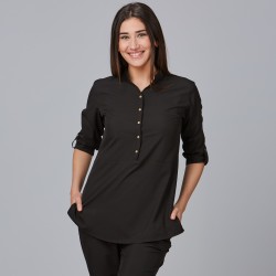 - El cierre central con botonadura no solo aporta funcionalidad sino también un elemento de diseño que agrega distinción a la blusa.