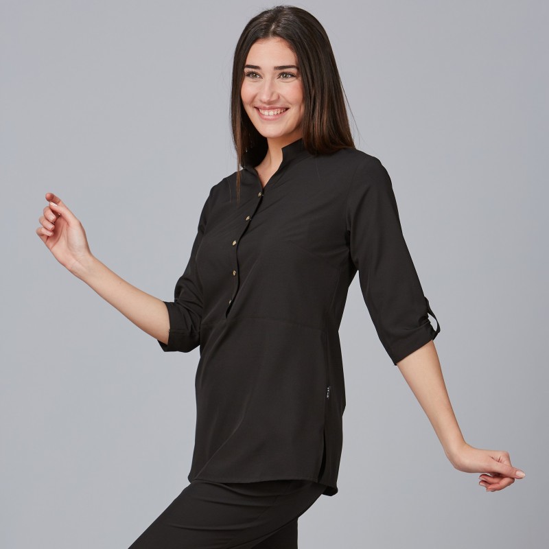 - Este diseño presenta un distintivo cuello mao que añade un toque de sofisticación, resaltando tu imagen en el sector de la peluquería.