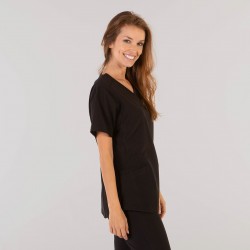 - Con cuello pico y tres bolsillos delanteros, dos de ellos en el lateral derecho